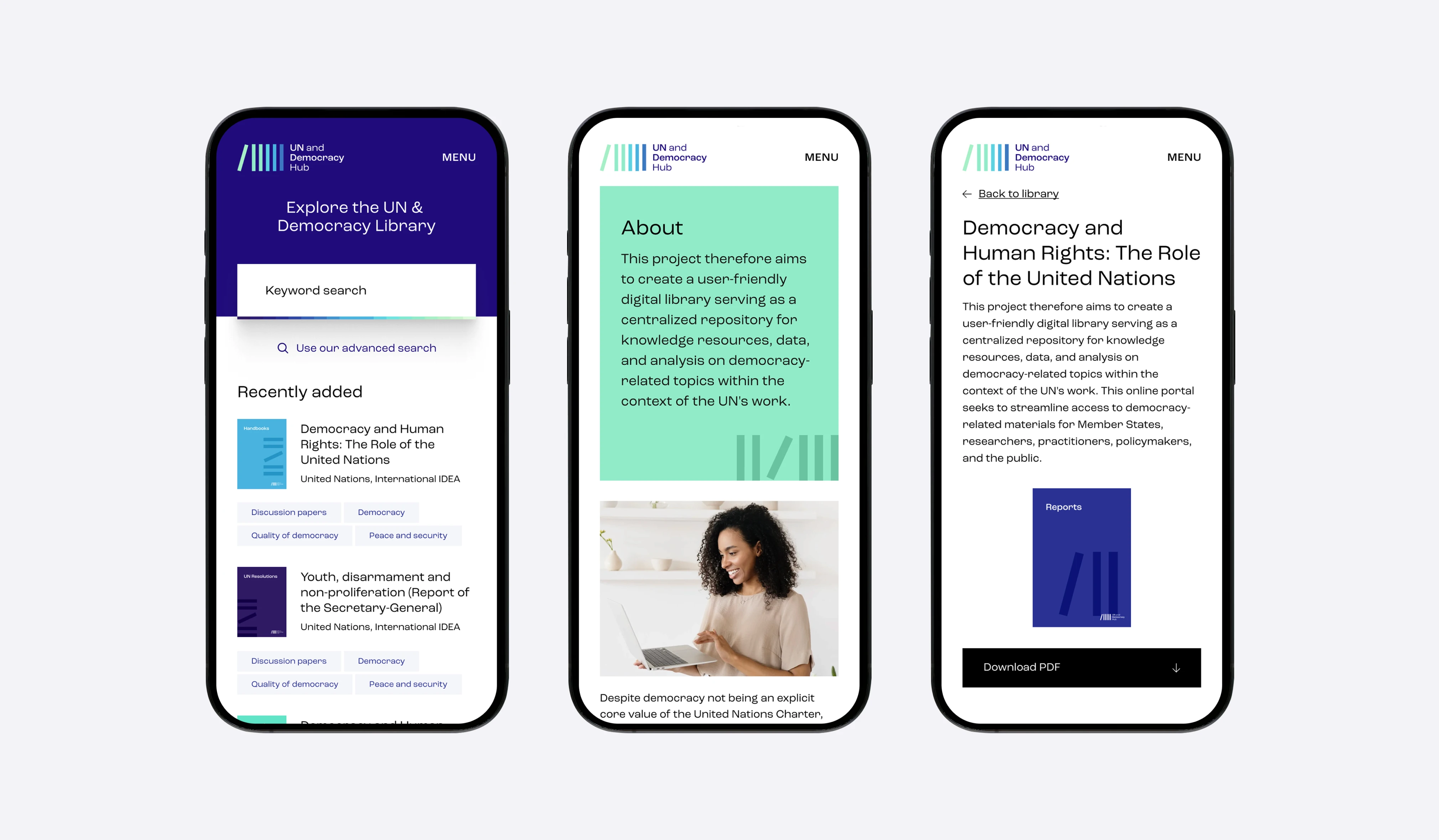 The UN and Democracy Hub acts as a crossover between International IDEA and the UN, where IDEA is a permanent observer. On this platform, resources relevant to this crossover can be browsed. Since this was an entirely new entity, we also created a new visual style to go along with it.